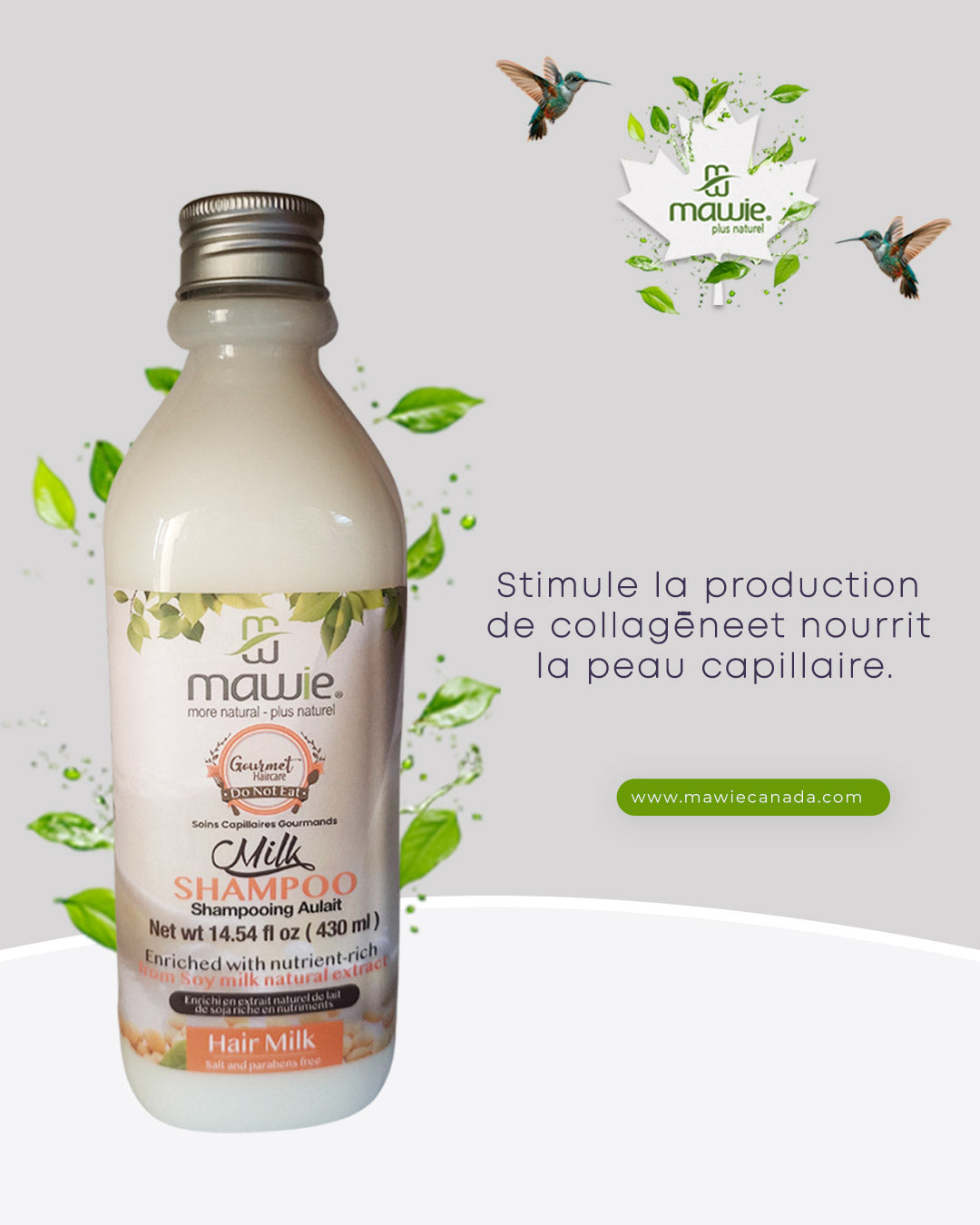 Shampoing au lait élaboré à partir d'ingrédients naturels : extrait de lait de soja et riche en nutriments.